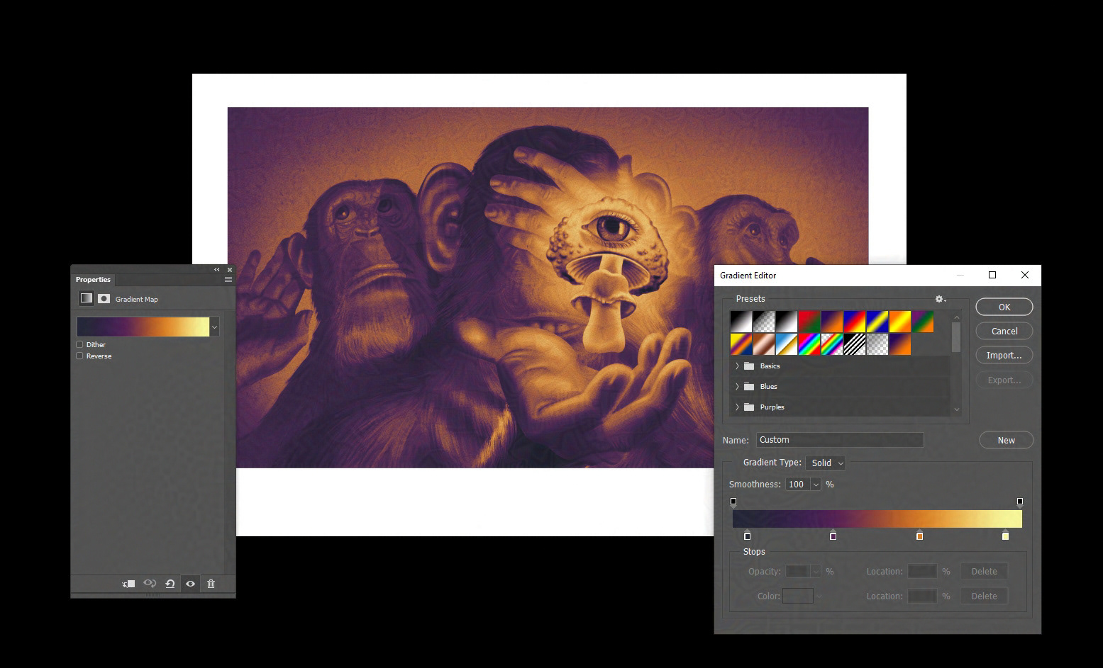 A new trick I learned recently from the illustration super genius Sterling Hundley is to lay in some quick color using a gradient map layer. The color on the right of the bar is highlights, and the left is the darkest tones. You can add in colors along the bar. Where ever the colors fall along the bar, that's the percentage of the gray scale it will affect. For this illustration I used a gradient of yellow, orange, purple and a very dark blue.