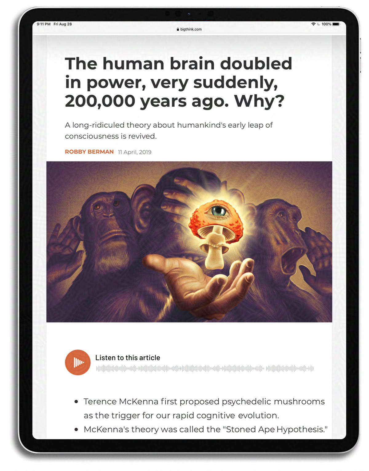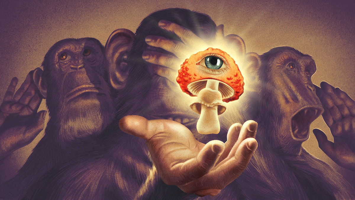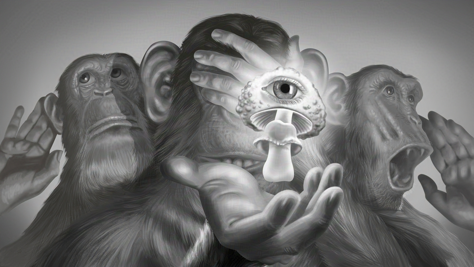 A play on “hear no evil, see no evil, speak no evil”, this illustration says the opposite. Terence McKenna, the creator of the “Stoned Ape Hypothesis” believed the possible introduction of psilocybin into the diet of Homo Erectus may have enhanced their senses, and opened their minds to abstract thought. This may have been a catalyst which led to the development of art, music, language, moral values and religion.