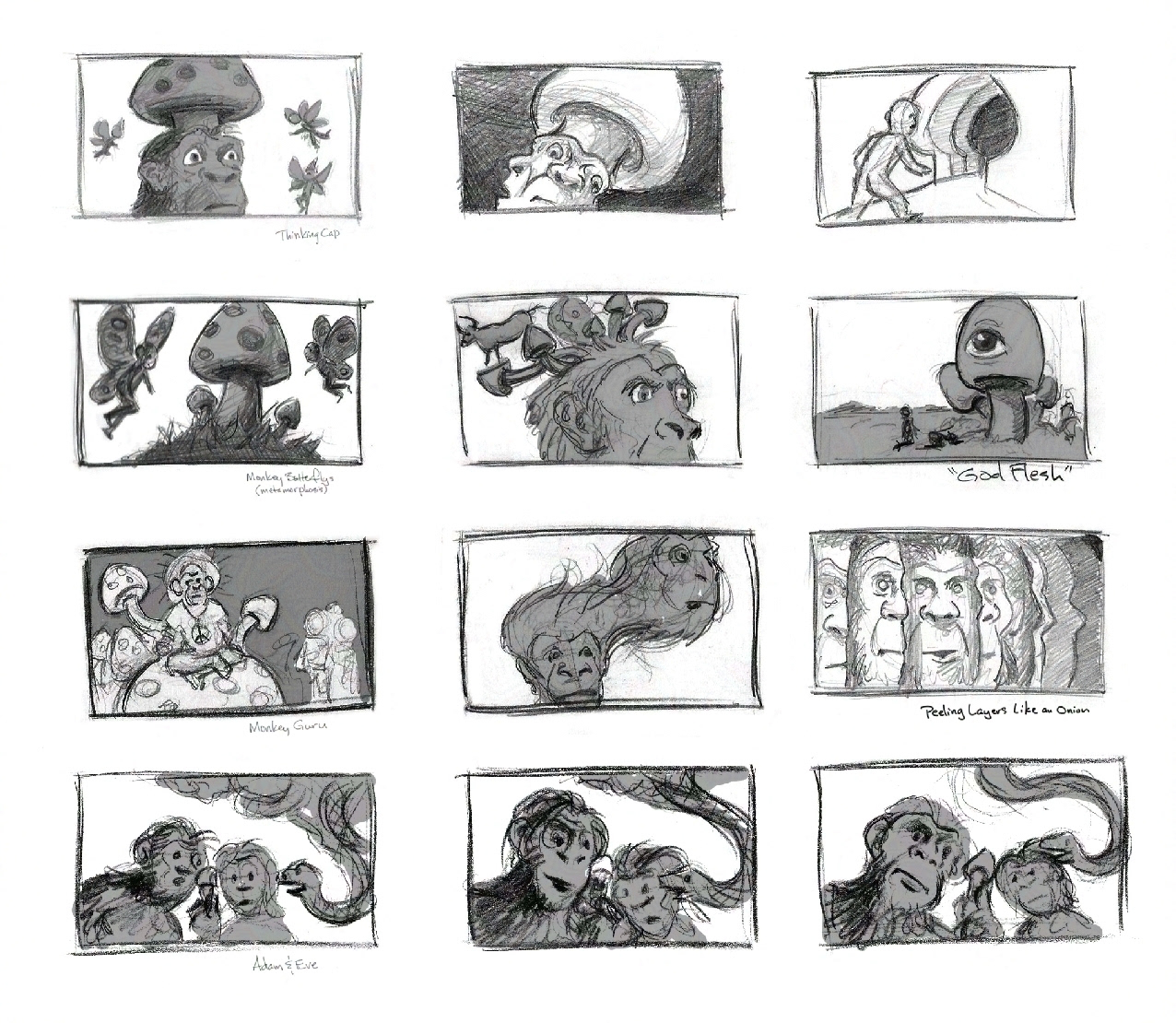 The ideas I like most I'll sketch out in a bit more detail. I also try to work out some of the values to help figure out the composition and lighting. An explanation of the concept is included to be sure the intention of the image is clear.