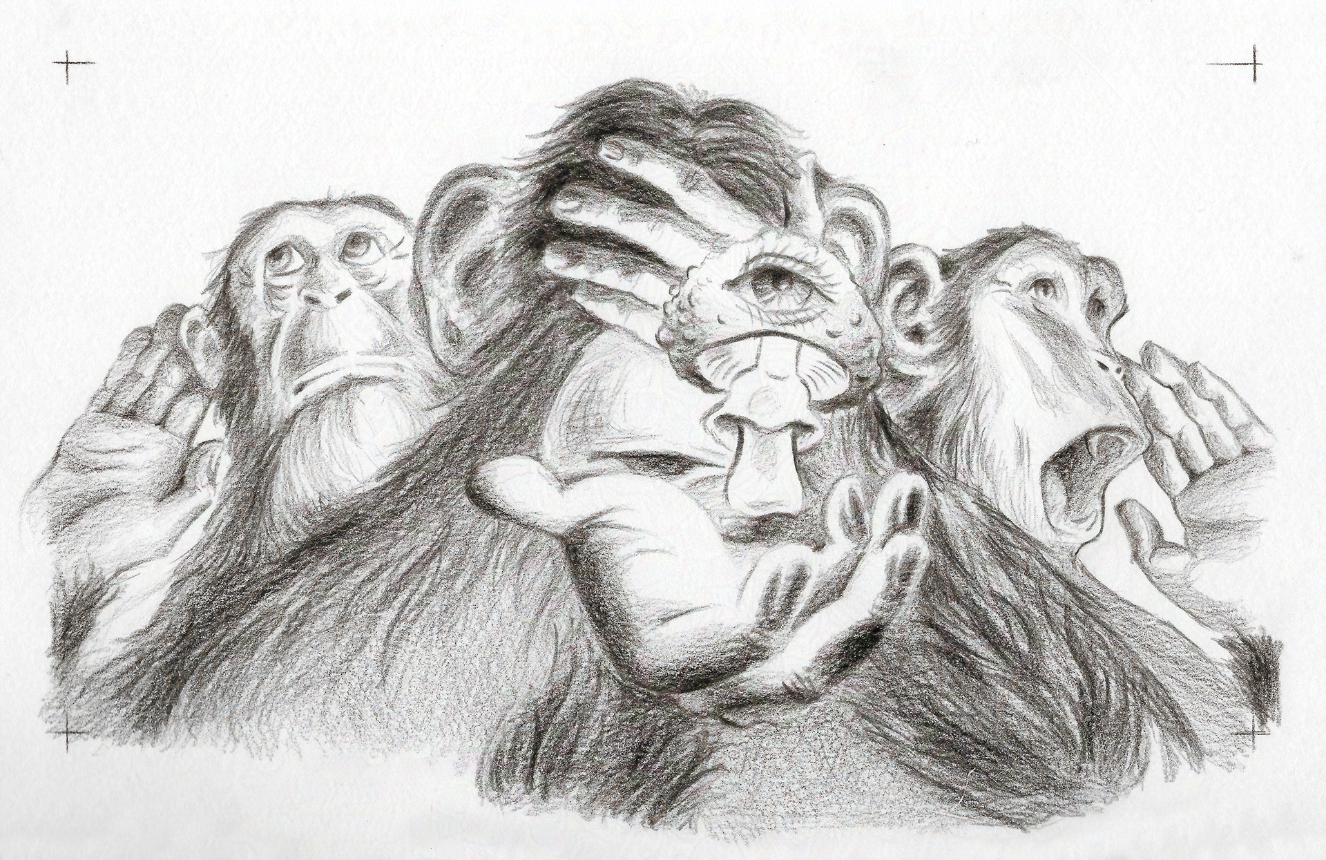 Once a direction has been determined, I gather reference to help me figure out the details of the image. For this illustration, since I was going with the Japanese maxim of the Three Wise Monkeys, I decided to go with chimp reference rather than reference of Homo Erectus. I can't just use someone else's photos of chimps, but I can look at them for details. I took pictures of myself to help figure out gesture and lighting. It wasn't a big stretch from there. ;^) I took about 117 pictures of myself, using a camera remote, trying out as many angles as I could. Here are the ones I found helpful: